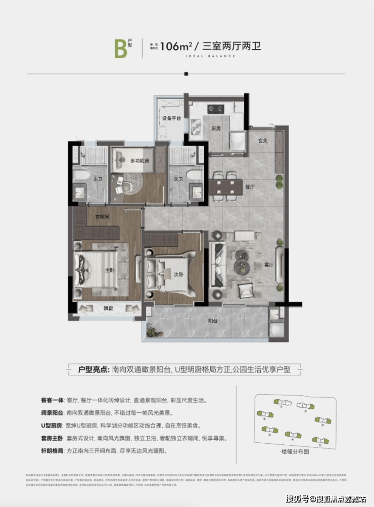 户型亮点:南向阳光三开间,全明双卫设计,公园生活舒享户型