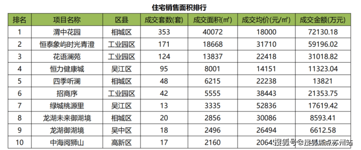 上周成交面积 TOP3 的项目为相城区的渭中花园和工业园区的恒泰象屿时光青澄、花语澜苑。