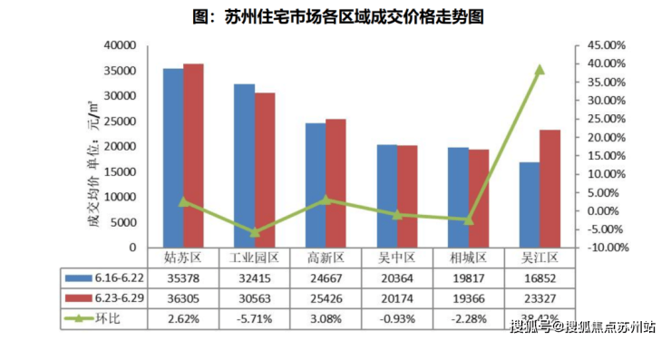 上周成交均价最高的为姑苏区 36305 元/㎡,环比上涨 2.62%;其次为工业园区,成交均价 30563 元/㎡,环比下跌 5.71%。上周全市住宅均价 24069 元/㎡,环比上涨 15.42%。