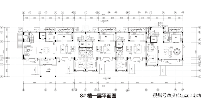 8#一层,包括中间户、东西边户3种户型.中间户南向面宽约9.2米,南向卧室与公区形成围合效果;西边户南向面宽约9.75米,横厅格局,一层没有设计卧室;东边户面宽最大约11.2米,大横厅+卧室+双卫,尺度更开阔.