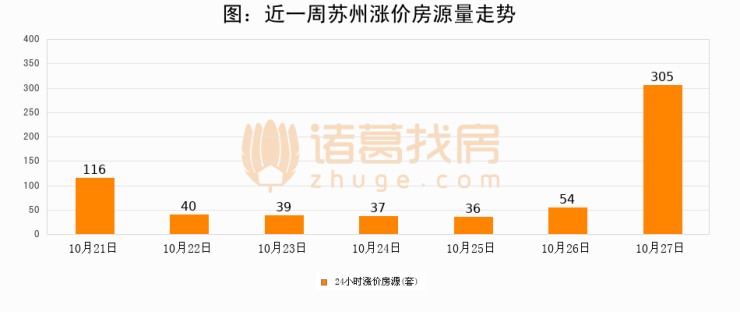 根据诸葛找房数据显示,苏州24小时涨价房源量为305套,较10月26日增加251套,环比上涨464.8%。与此同时,涨价房源占比小幅扩大,业主信心有所提升。