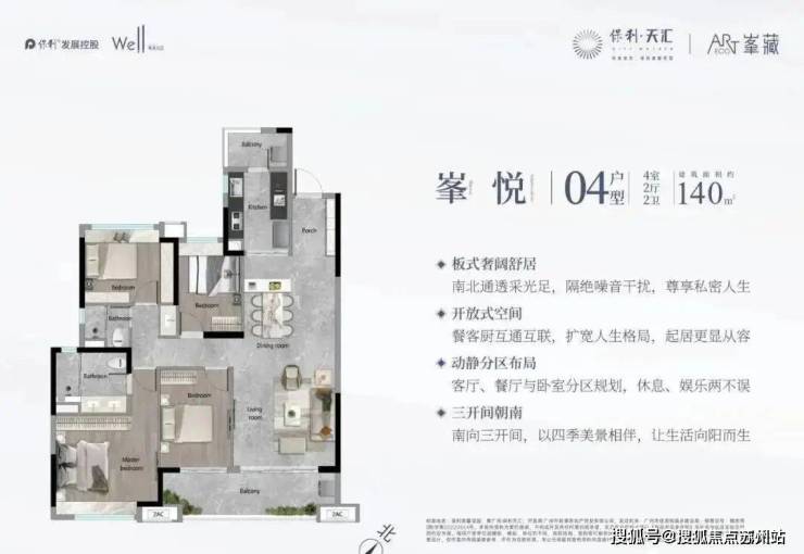 保利天汇的140平米四房户型设计非常宽敞舒适,南北对流户型使得采光和通风效果更佳,南向三开间保证了充足的采光和视野。餐客厅一体化设计增加了空间感和实用性。