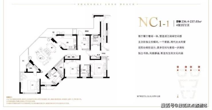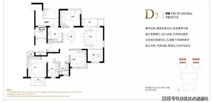奢华四房,超大观景横厅,主卧带南向宽景阳台客餐厅一体,独立书房。