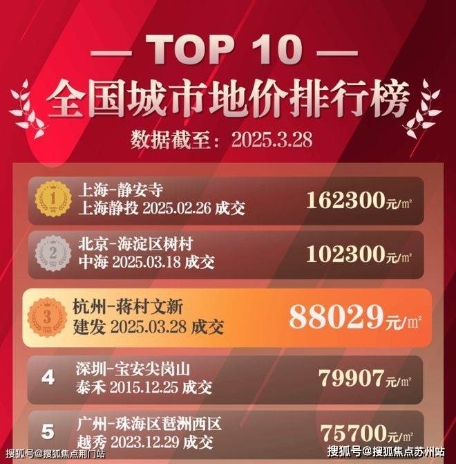 3月25日,滨江水电新村地块以7.74万/㎡的楼面价刷新了纪录;短短三天后,蒋村低密宅地更以8.8万/㎡的价格将杭州推进全国地价TOP3。