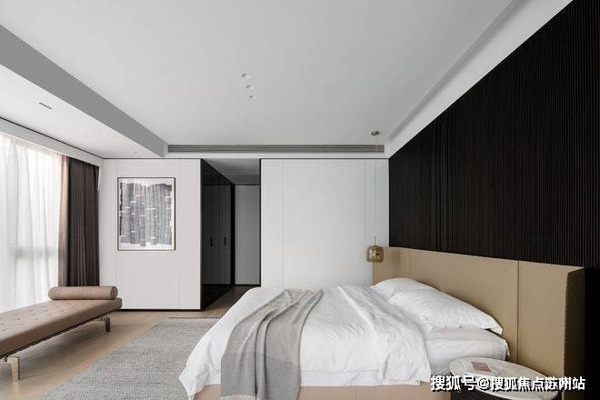 通过动线设计让睡眠区与衣帽、洗漱场景自然衔接,富有质感的木元素、艺术涂料、玻璃及金属材质,让居住者能一直处于比较自由和轻松的状态。