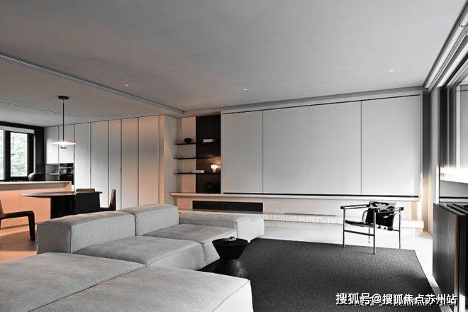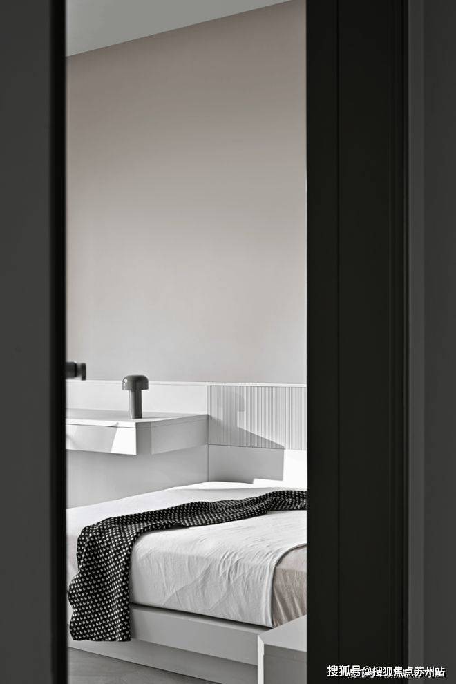 书房被藏在墙面的木色隐形门内,隐形门巧妙地在客厅与书房之间作了缓冲,避免白色“重叠”而造成疲劳感。