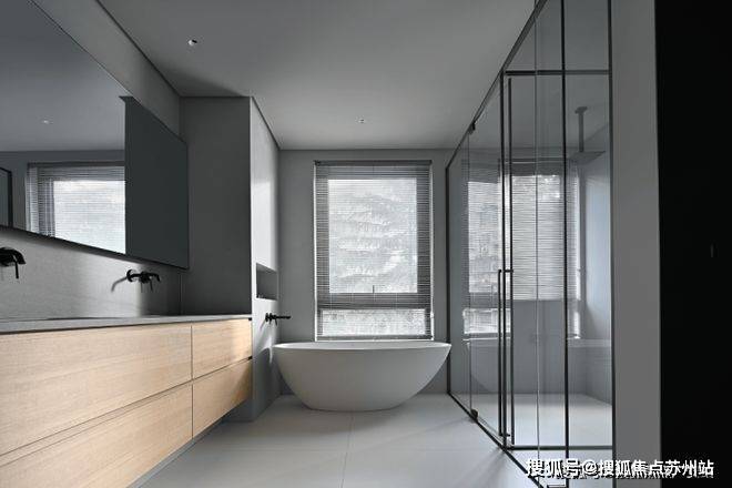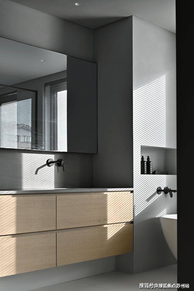 浴室贴心地做了三分离设计,完美践行了极简设计背后暗藏的功能主义。灰色与木色交融,创造出平和舒适的视觉体验。