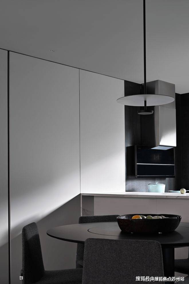 客餐厅采用一体化结构,扩大生活空间,也增进了一家人的亲密性。开放式厨房与餐厅之间由吧台隔断,高低差为一体化区域作下界限。