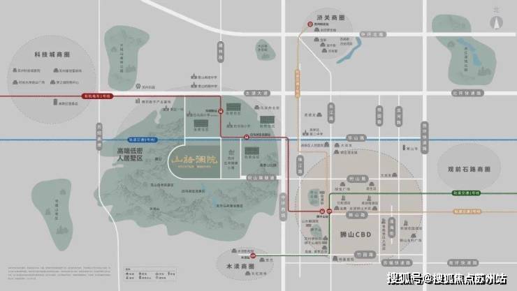 项目所处板块在地理位置上处于高新区中心位置,东有狮山核心CBD西有科技城,共享两个区域优质配套。以周边山水自然风光为基础,何山隧道为纽带,进一步连通项目与狮山片区。实现自然风光—项目—都市生活链条,构建多元生活场景。