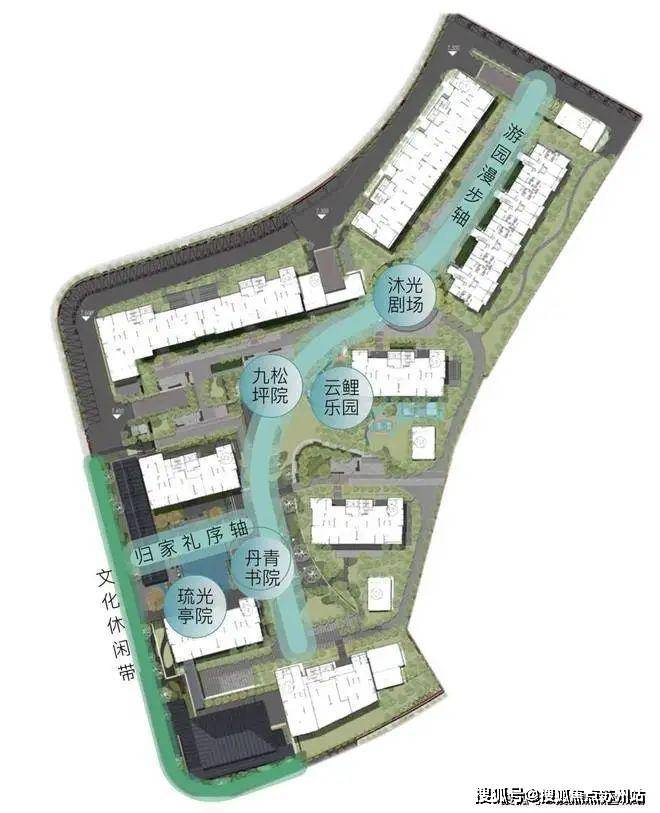 一带是文化休闲带,包括了「青绿游廊」和「青绿美学馆」串联起来的这条青绿带,两轴是归家礼序轴和游园漫步轴,而六园则包括了琉光亭院、丹青书院、飞虹卧波、九松坪院、云鲤乐园和沐光剧场。