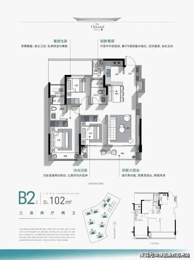 ★ B户型 建面约102㎡,三室两厅两卫布局,三开间朝南+双阳台设计。