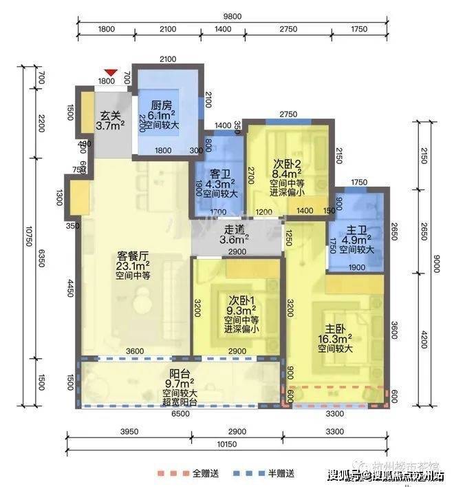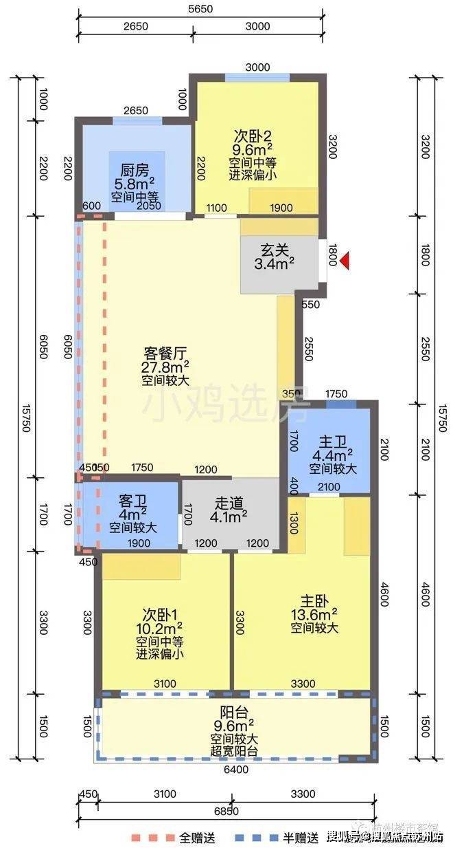 这是值得特别关注的神户型了,103方做到了边厅户型,客餐厅自带约6.05米长的大飘窗,主卧和次卧两开间朝南,带一个6.4米长的双联超大阳台,整体户型的尺度做出了小改善的感觉。整体户型没有什么浪费,得房率较高,是刚需极佳的自住良品。