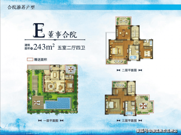 采用类独栋的设计,可将2套双拼合并为一套独栋别墅,董事合院则结合中国传统合院理念,以2套双拼+3套联排别墅的组合提供四代同堂多重户型选择。