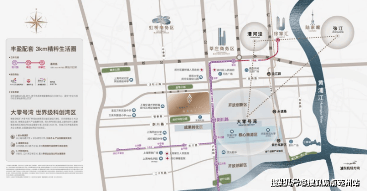 项目与5号线剑川路站的直线距离仅有1km左右,通过5号线可以直达莘庄城市副中心,并换乘1号线到达徐家汇、人民广场等核心CBD
