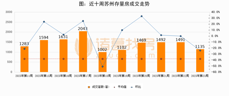 存量房方面,第23周苏州存量房成交1135套,较上周减少356套,环比下降23.9%。从近十周成交走势来看,周均成交套数为1424套,本周低于平均水平20.3%。
