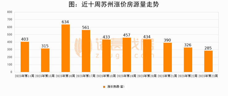 从调价房源来看,第23周苏州涨价房源285套,较上周下降12.6%。与此同时,23周涨价房源占比提升0.6个百分点,业主信心持续恢复。