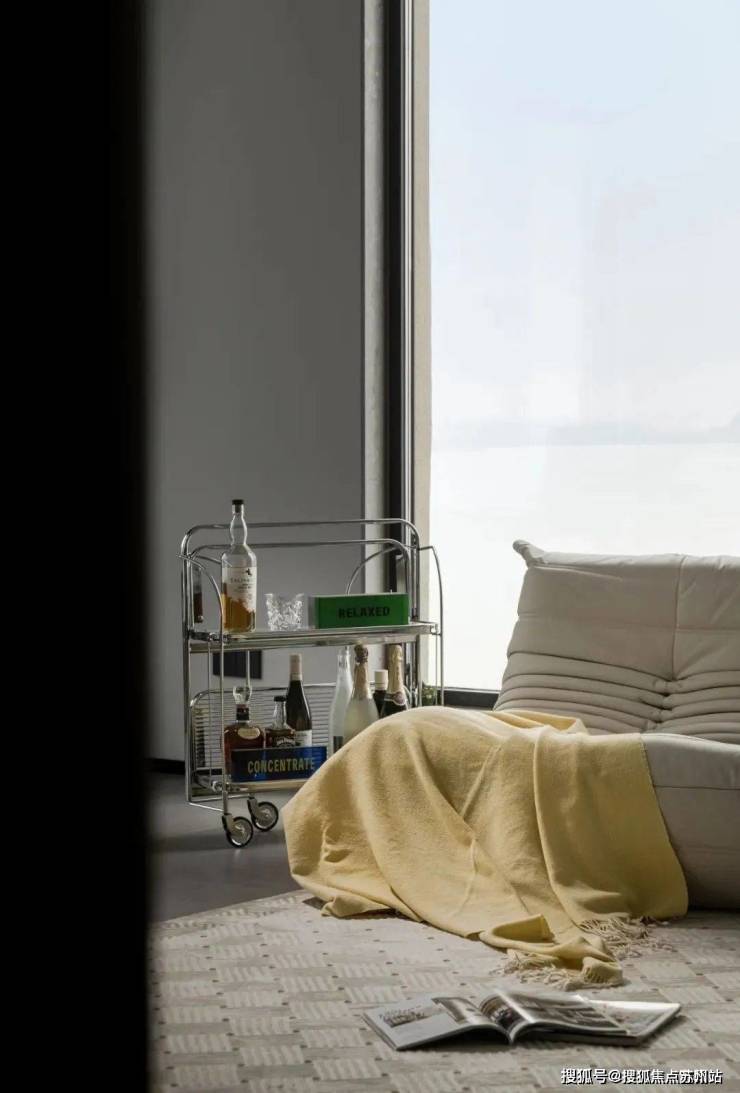 客厅尽显家的温柔,大面积的落地窗不仅方便了观景,采光也是利用到了极致,并没有采用传统的沙发组合,而是用懒人椅和坐凳零散的摆放在地毯上,更显柔和与慵懒.