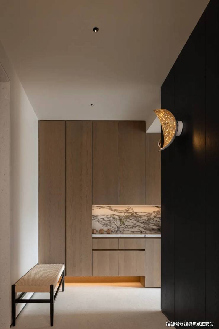 推开家门,一面深邃的黑木墙映入眼帘,如同一幅静谧的画布,仅以两盏独特的装饰灯点缀,仿佛预示归途的灯塔。