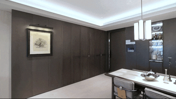 如果说吊顶是建筑的皮肤,那么墙壁便是灵魂的铠甲。卧室区域外,除了s空间,墙壁均为木饰面+岩板,并且使用了天然昂贵的影木,橡木。