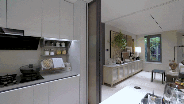 走进厨房,四联动拉丝玻璃移门正上演变形记,封闭模式隔绝油烟,半开放模式连通餐厅,全开模式则让烹饪成为社交秀场。