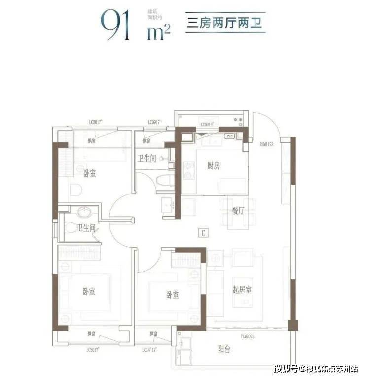 建面约91㎡3房2厅2卫▼