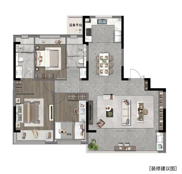 户型设计是金地峯范的一大亮点,实用率高,设计感强。 约103㎡:做成三房两卫,带约6.8米的大阳台,功能齐全,是入驻狮山的高性价比之选。 约117㎡:拥有约5.6米的超大横厅,客厅空间非常阔绰,聚会、休闲体验感极佳。 约135㎡:升级为四房两卫,尺度更为宽裕,是追求品质改善家庭的理想选择。