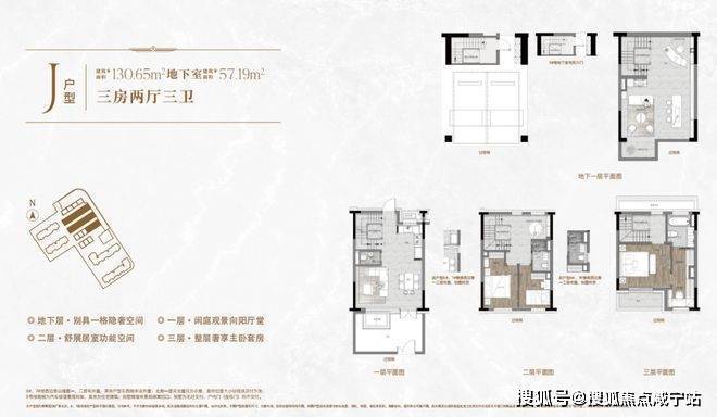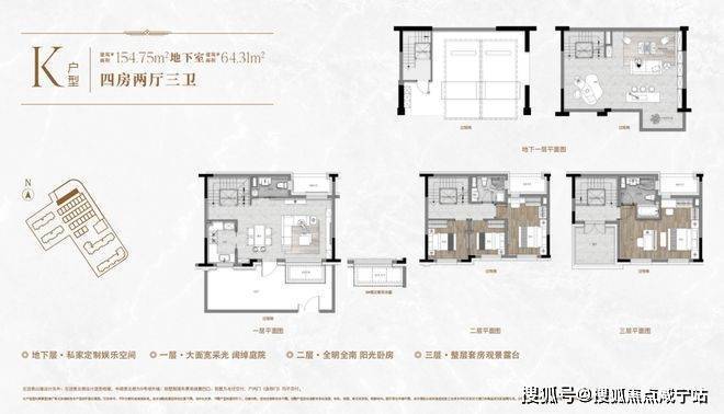 一楼和地下室主社交和志趣,二楼是子女的房间,三楼是主人休憩区.