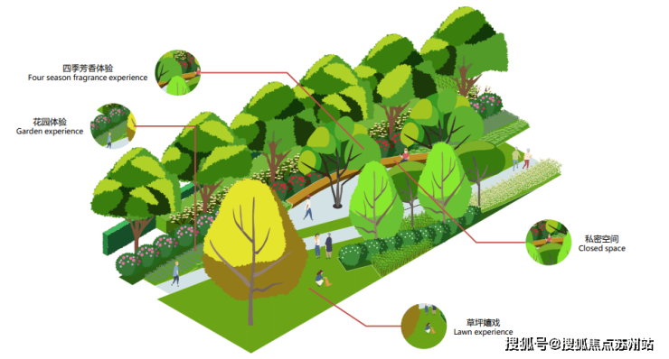 社区规划“一轴、三环、八境”的空间结构,“礼仪大门、中央花园、邻里空间、归家小径、浓荫庭院”多重归景观节点,实现仪式、社交、归家三重设计。