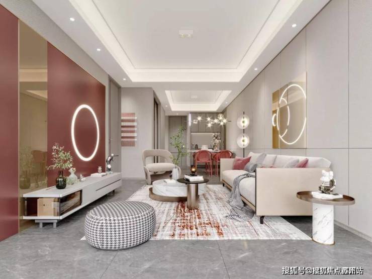推开家门, 首先映入眼帘的就是窗外的风景,客厅和景观阳台的连通一体,超大景观阳台视野开阔,打破了空间原有的界限,同时也给光彩创造多尺度引入室内的可能,从进门一刻就是一场视觉盛宴;目光转回,现代时尚的客厅空间也别具氛围,浅木色的环境背景置入一些暖色点缀,优雅轻奢瞬间就成为空间的主调。