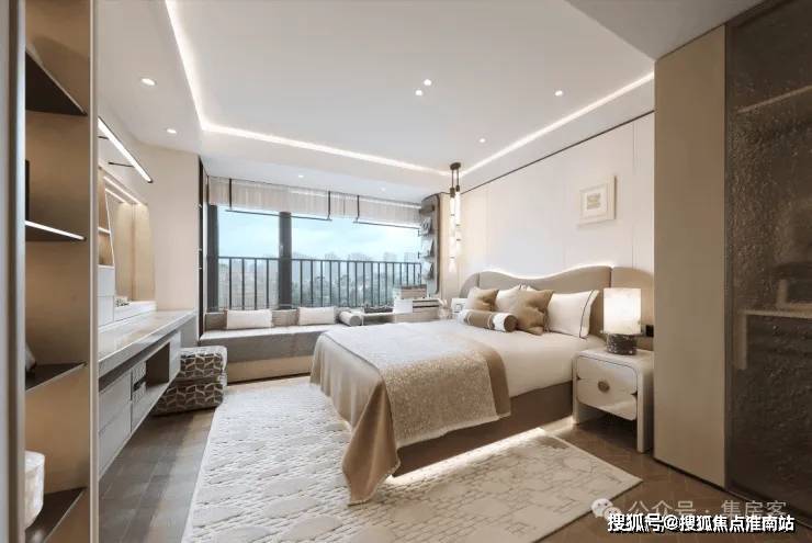 在春来晴翠园 建面约169㎡晴翠户型中,最亮眼的设计显而易见—— 主卧90°转角窗,揽获270°环幕视野,将天光云影尽纳室内。不仅引入绝佳采光与风景,更成为一处心灵栖所。