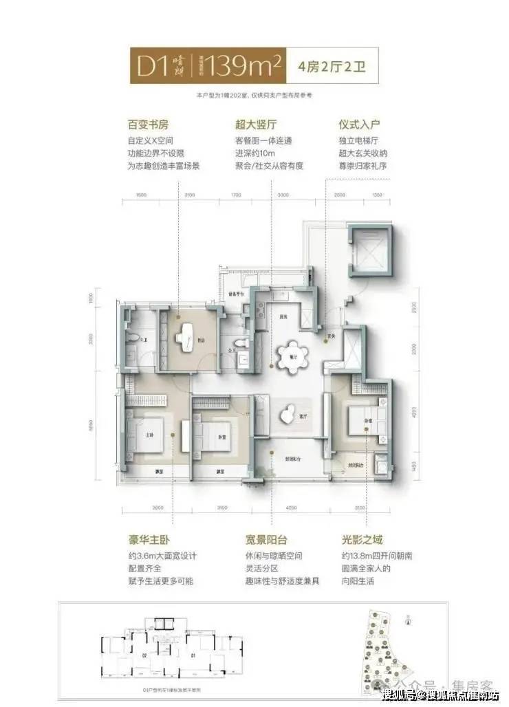 建面约139㎡南向四开间,引阳光肆意倾洒, LDK一体化宽厅,打破空间隔阂,成为家人互动、朋友欢聚的核心场域, 餐厨开放式设计,让烹饪不再孤单, 自定义X空间,实现“不为人生设限”, 次卧家政阳台,兼顾实用与观景, 约3.6米奢阔主卧,妥帖安放身心, 精细化收纳,生活井然有序......