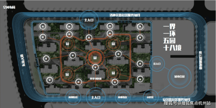 社区采用人车分流设计,在景观规划上,上实望海采用“一界一环五园十八境”景观法则,侧写九大生活场景。