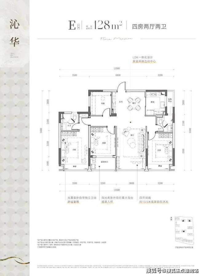 此宽境四房,既满足居住功能性,又有舒适的居住空间。三卧室+客厅,四开间朝南,享受约13.5米阔绰大面宽;灵活可变3+1房,契合三代同堂居住需求;U型厨房动线顺畅,一体化双厅,足以让家人欢聚一堂;小家化主卧套房,舒适感触手可及。