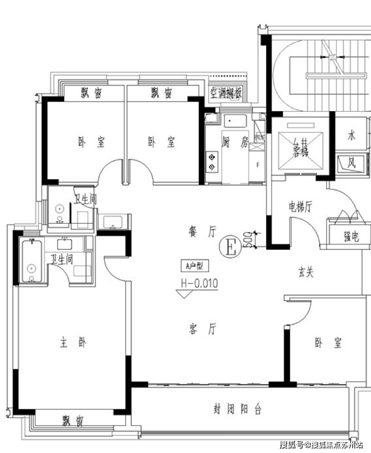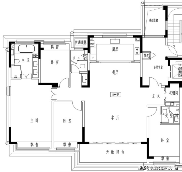 大方厅设计,开间约5.7米,封闭阳台开间约8米,主卧套房带浴缸,开间达到约4.1米,全屋3个飘窗,尺度舒适。