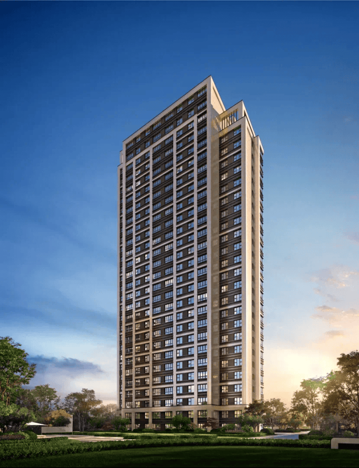 外立面采用新海派风格,石材+铝板线条,典雅摩登;