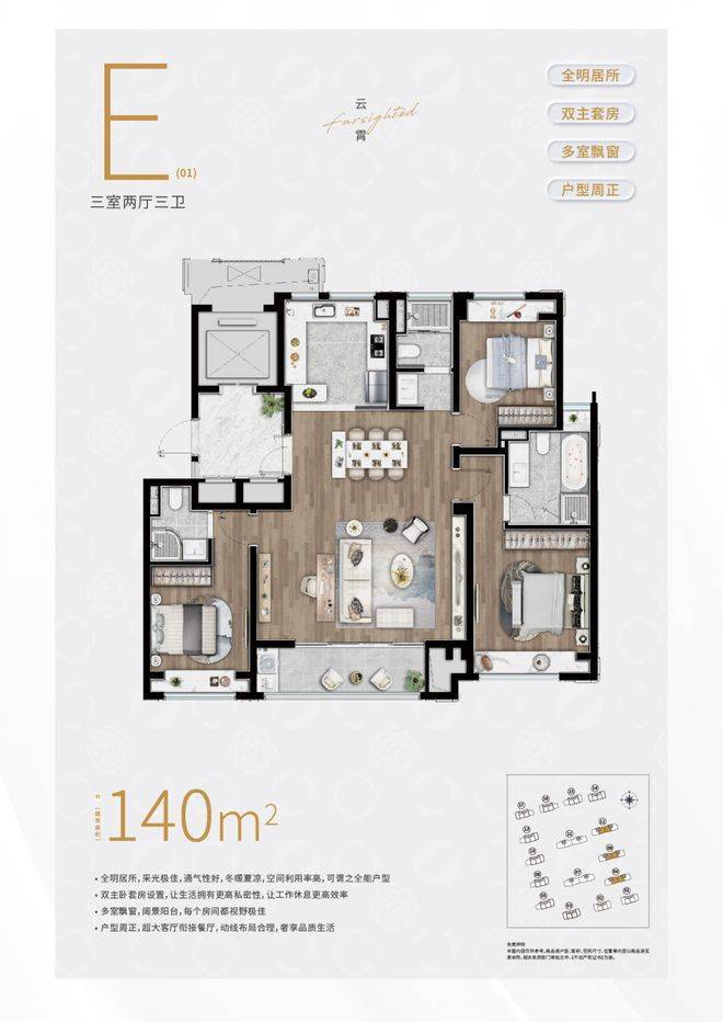 建面约140㎡3房3卫户型,三开间朝南+大横厅的设计,整个南向采光面相当宽绰。