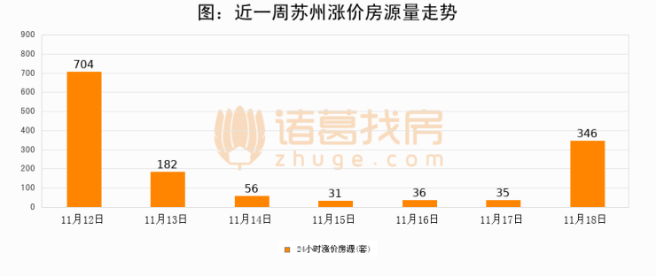 根据诸葛找房数据显示,苏州24小时涨价房源量为346套,较11月17日增加311套,环比上涨888.6%。与此同时,涨价房源占比小幅扩大,业主信心有所提升。