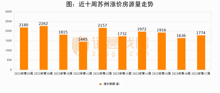 从调价房源来看,第47周苏州涨价房源1774套,较上周上涨8.4%。与此同时,47周涨价房源占比回落1.68个百分点,业主信心小幅波动,购房者可则需入市。