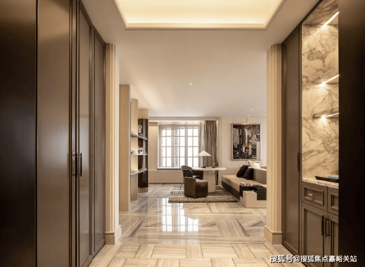 进入室内的入户玄关收纳空间,地面采用静雅棕、宝格丽兰石材拼花设计,古典回形波打+实心铜条的搭配增强入户尊贵感。右侧是山水白奢石的开放格,左侧是行李间,通过暗门的做法,将功能结合进去,强化了归家的仪式感。
