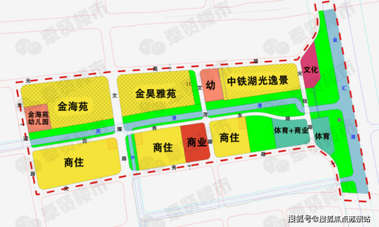 区域内(苏贤港南)规划有3幅商住用地、1幅商业用地,以及体育、绿地用地。苏贤港南侧沿河新增百秀东路。