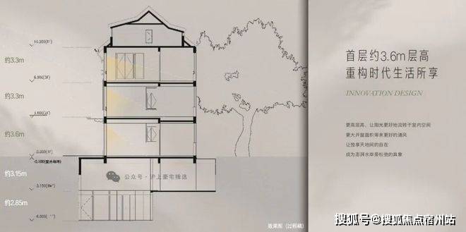 约3.6m首层层高,阔尺采光面。