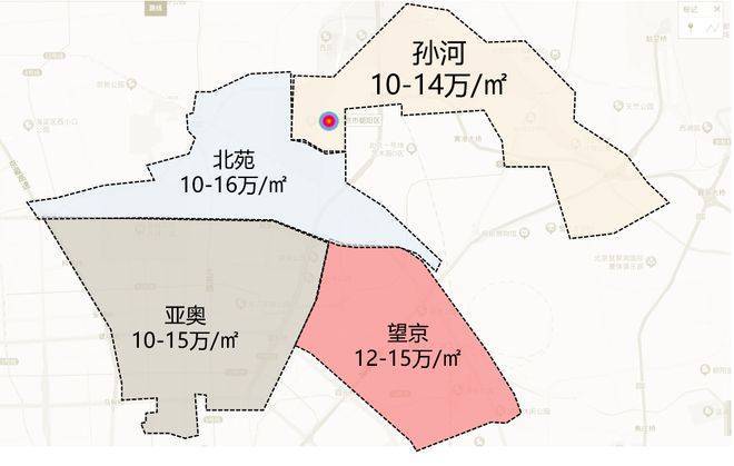 望京、亚奥商圈已经多年没有新房供应,项目周边二手房挂牌价在10-15万/㎡,距离本项目3公里的望京金茂府、臻园价格在12-13万/㎡,望京豪宅均价12-15万/㎡,北苑12万/㎡,孙河10-13万/㎡,亚奥10-17万/㎡。望京国誉府以9万+的价格,填补市场空白,相较二手房市场,拥有2万+的价格差,优势明显。