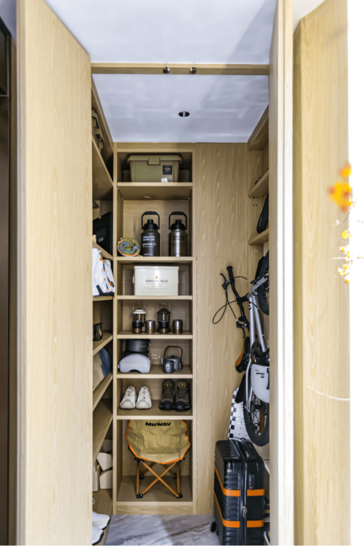 独立电梯厅营造出私密的归家体验,延伸了生活的尺度。入户门厅巧妙过渡内外空间,配备钢木子母复合门,安全可靠;门锁选用凯迪仕五合一智能门锁,支持多种解锁方式,配备室内大屏,科技感与安全感并存。
