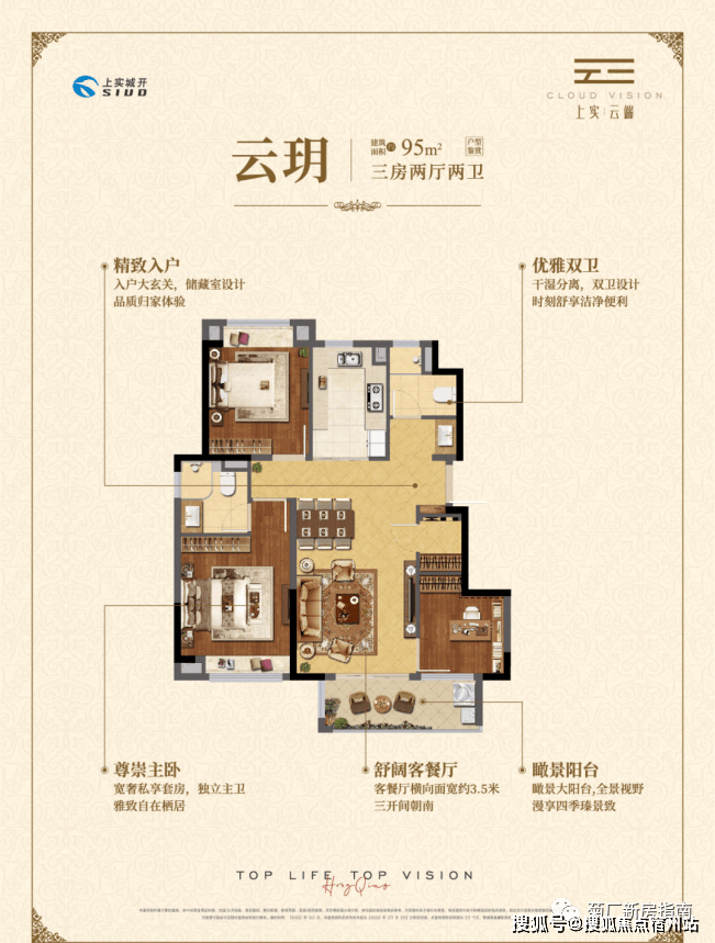 约95㎡三房两厅两卫,做到了三开间朝南+瞰景大阳台+主卧套房设计+南北通透+卫生间干湿分离,该户型得房率和空间利用率都非常高。