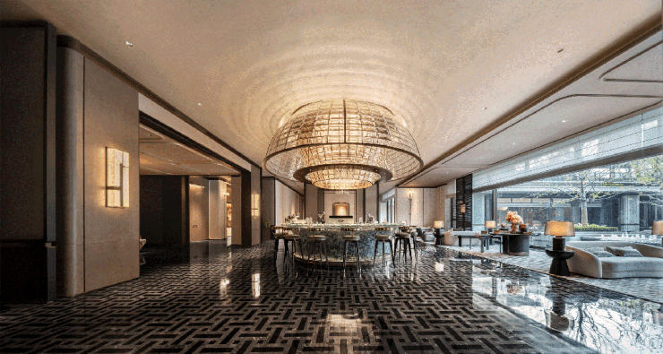 酒店入户同样是对标半岛酒店,车马院落客区的檐口、标识、星空顶等,增强入户的仪式感和奢华感。落客区的接待门采用海鸥丽晶酒店同款,尽显酒店式归家体验。