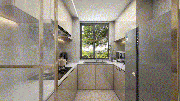 厨房采用U型操作台面设计,操作空间非常充裕,切配区和烹饪区被很好的分隔开来,可以同时容纳两个人同时操作,享受烹饪乐趣。