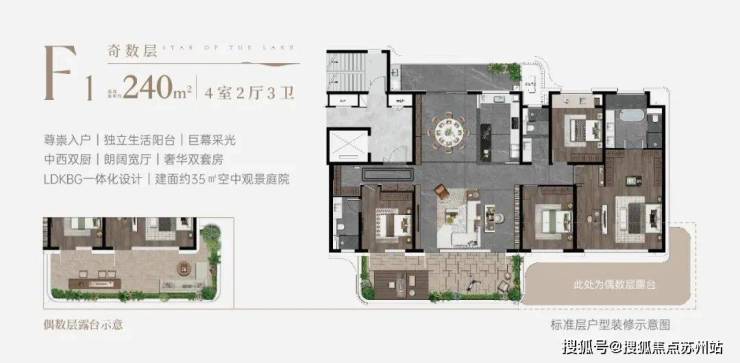 这一户型也是4房3卫,南向约33平空中庭院,偶数层是270都观景设计。南向五开间,双卧室都是套房设计,且都是独立衣帽间和明卫。北向约9米生活阳台,连接餐厨空间。