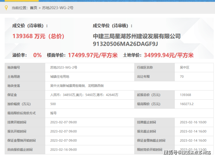 中建太泽之星 | 藏湖,即,苏地2023-WG-2号地块,位于吴中太湖新城景周街南侧、龙翔路西侧,是2023年2月16日,中建三局以底价139368万元竞得,成交楼面价17500元/平。