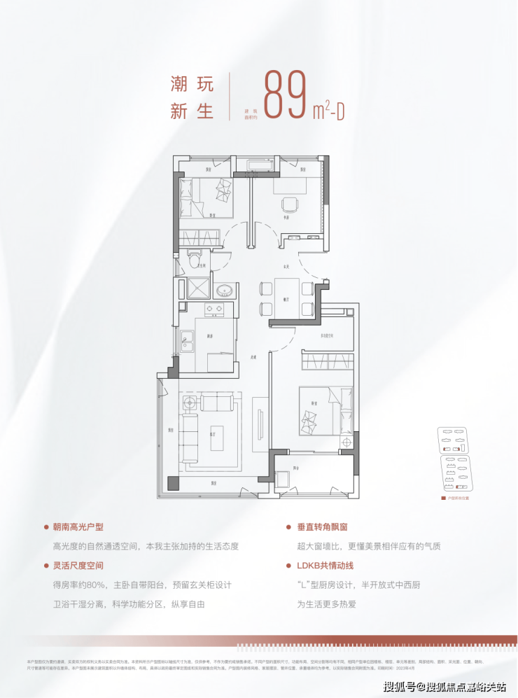 不同于一般的三房把这个小房间直接做了主卫,这个项目把选择权留给了购房者,并在下方铺设了上下水管、相当人性化!除了以上亮点之外,这个户型还有惊喜小细节.为了解决爱买买买的年轻人收纳痛点,户型设计上保留了厨房最大的收纳空间,可以打双组吊柜.在主卧和次卧都预留了收纳柜的位置.除了三开间朝南的经典户型,89m²还做了三面通风的户型.
