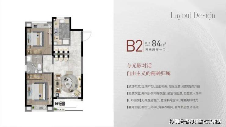 建面约84㎡2房2厅1卫,做到了双开间朝南+双卧室带飘窗+动静分离,非常宽敞的2房户型。